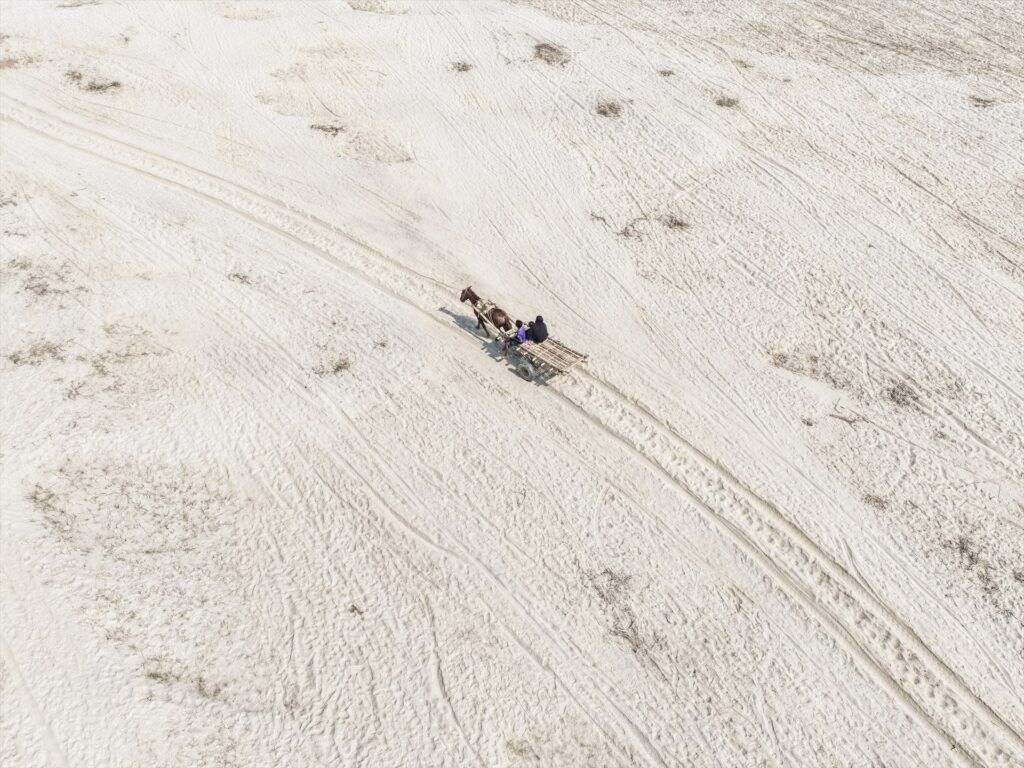 Un carro tirado por caballos viaja a través de un char seco del río Brahmaputra en Gaibandha, Bangladesh
