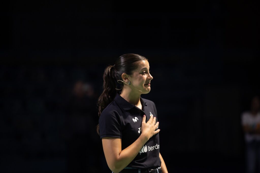 Carolina Marín, tras anunciar su retiro del bádminton. El homenaje ha tenido lugar en la previa a la celebración de la final del Campeonato Europeo de Bádminton en el Palacio de Deportes Carolina Marín (Huelva)