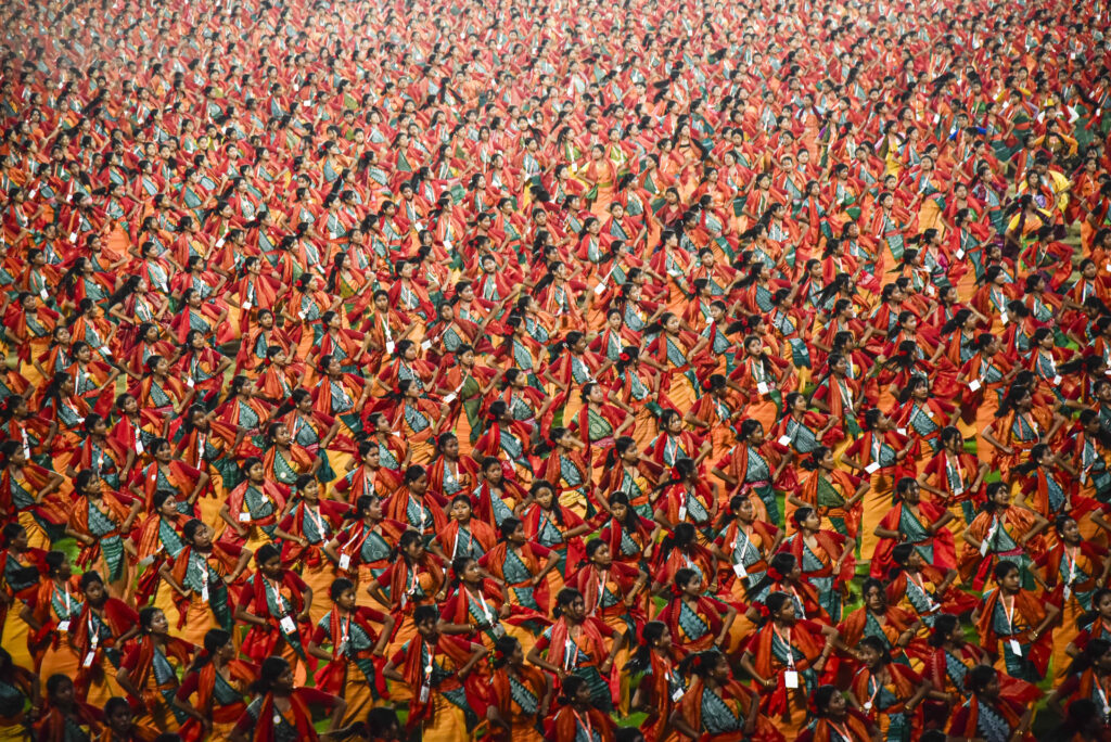 Bailarines de Bagurumba con atuendos tradicionales ensayan en el estadio Sarusajai antes de un intento de récord mundial Guinness por la actuación más grande de la 'Danza de las mariposas' de la comunidad Bodo en Guwahati, Assam, India.