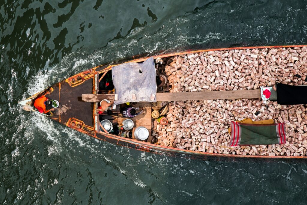 Bangladesh, Dhaka: Barcos de carga repletos de ladrillos se deslizan por el río Dhaleshwari en Munshiganj, sirviendo no solo como embarcaciones de transporte sino también como mundos flotantes de supervivencia.