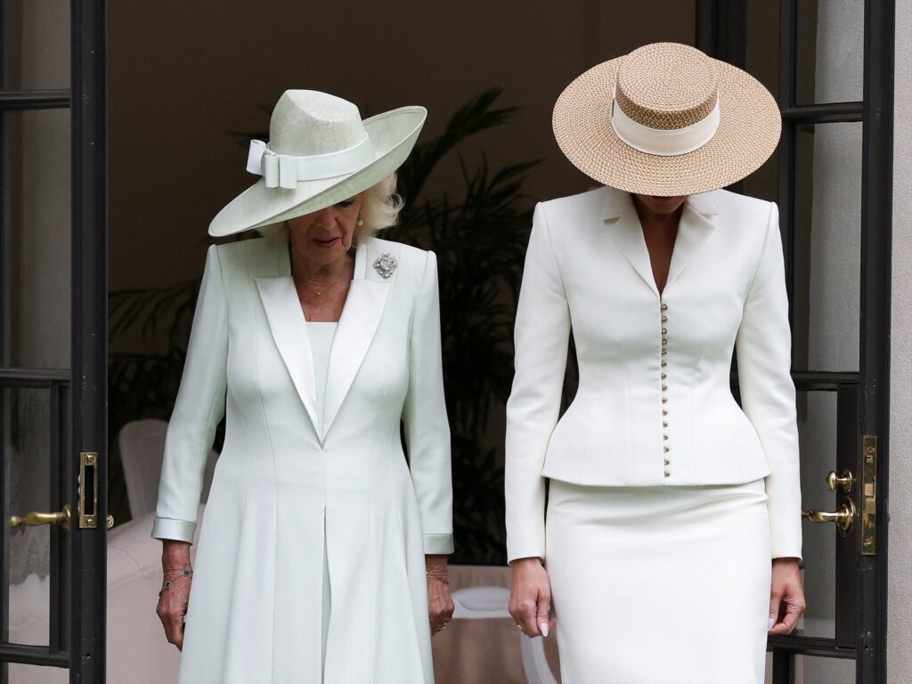 La reina Camilla del Reino Unido y la primera dama de Estados Unidos, Melania Trump, caminan por el pabellón de tenis de la Casa Blanca en Washington, para un evento educativo donde los estudiantes utilizan auriculares de realidad virtual y gafas con inteligencia artificial para ver objetos de la Colección de la Casa Blanca y de la Administración Nacional de Archivos y Registros, para aprender sobre la historia de Estados Unidos y el Reino Unido.
