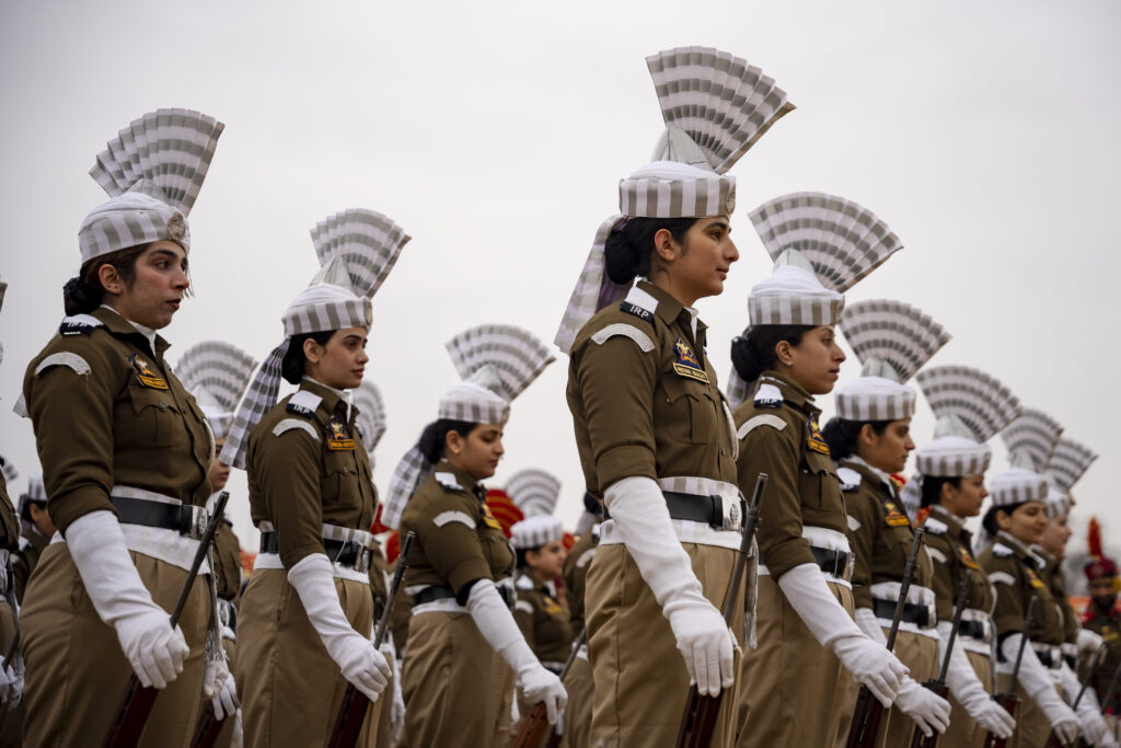 Contingentes de la Policía de Reserva de la India (PRI) actúan durante el desfile del Día de la República en Srinagar. India celebra su 77.º Día de la República, aniversario de la adopción de la Constitución de la India y la transformación de la nación en república el 26 de enero de 1950.