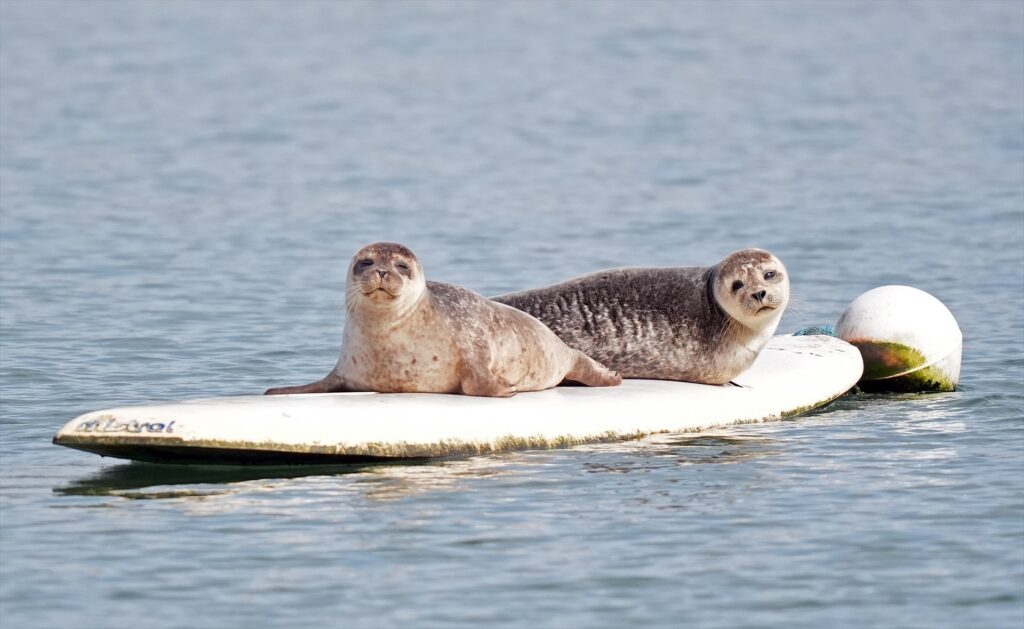 Dos focas tumbadas sobre una tabla de surf en el estuario de Dungarvan.