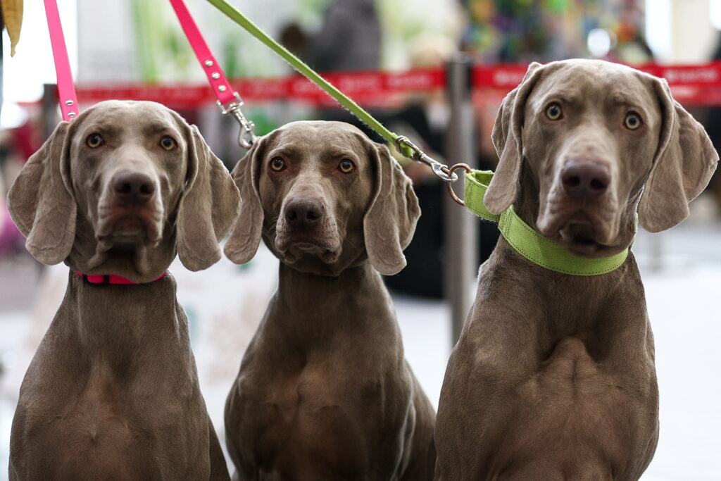 Weimaraners en la exposición nacional canina de 2026 en memoria de Leonid Sabaneyev en el Centro de Exposiciones Kazan Expo en Bolshiye Kabany.