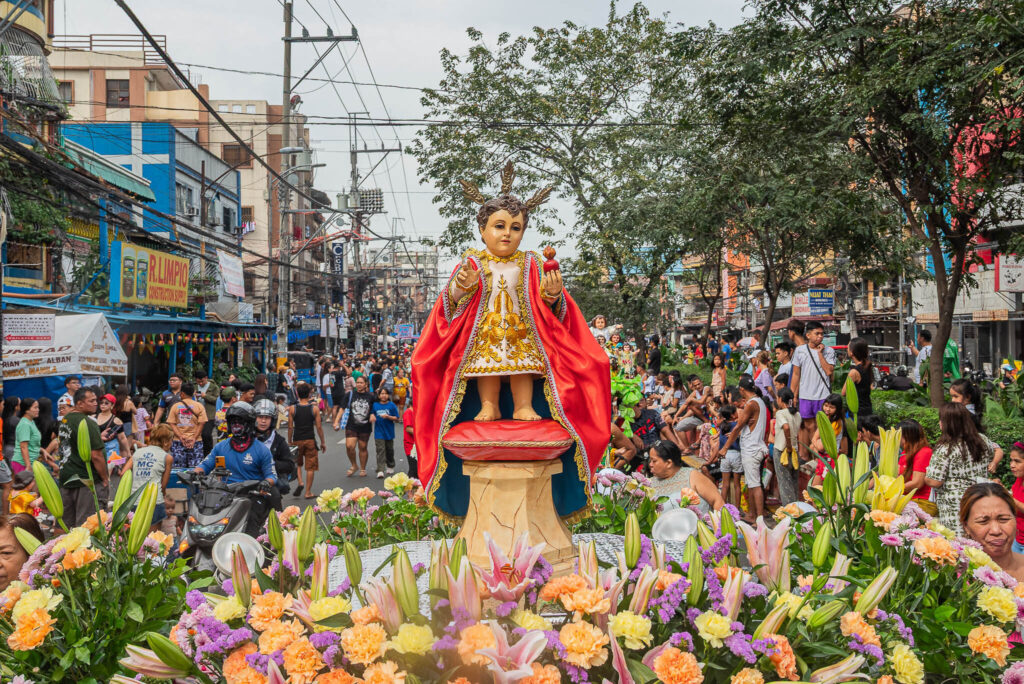 Una figura del Santo Niño Jesús se ve en una carroza tirada por fieles durante un desfile. La veneración del Santo Niño es parte fundamental de la fe católica y una de las festividades más importantes de Filipinas.