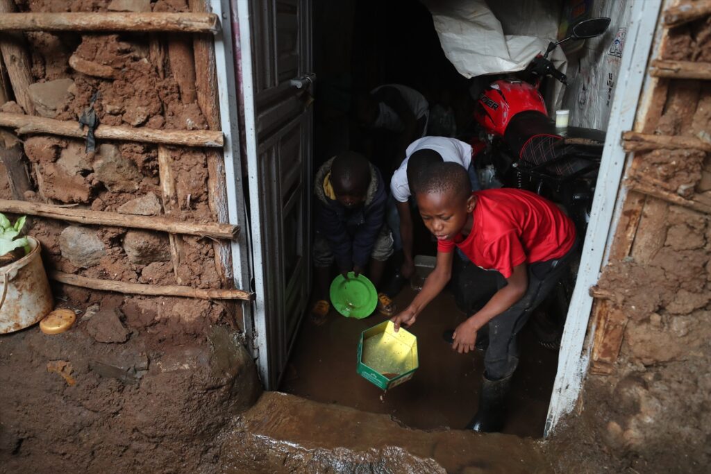 Unos niños drenan el agua de lluvia de una casa después de una fuerte lluvia en Kibera, Nairobi, Kenia, el 7 de marzo de 2026. El número de muertos por las fuertes lluvias nocturnas que provocaron graves inundaciones en varias partes de la capital keniana, Nairobi, ha aumentado a 23 mientras los equipos de rescate continúan buscando sobrevivientes, confirmó la policía el sábado.