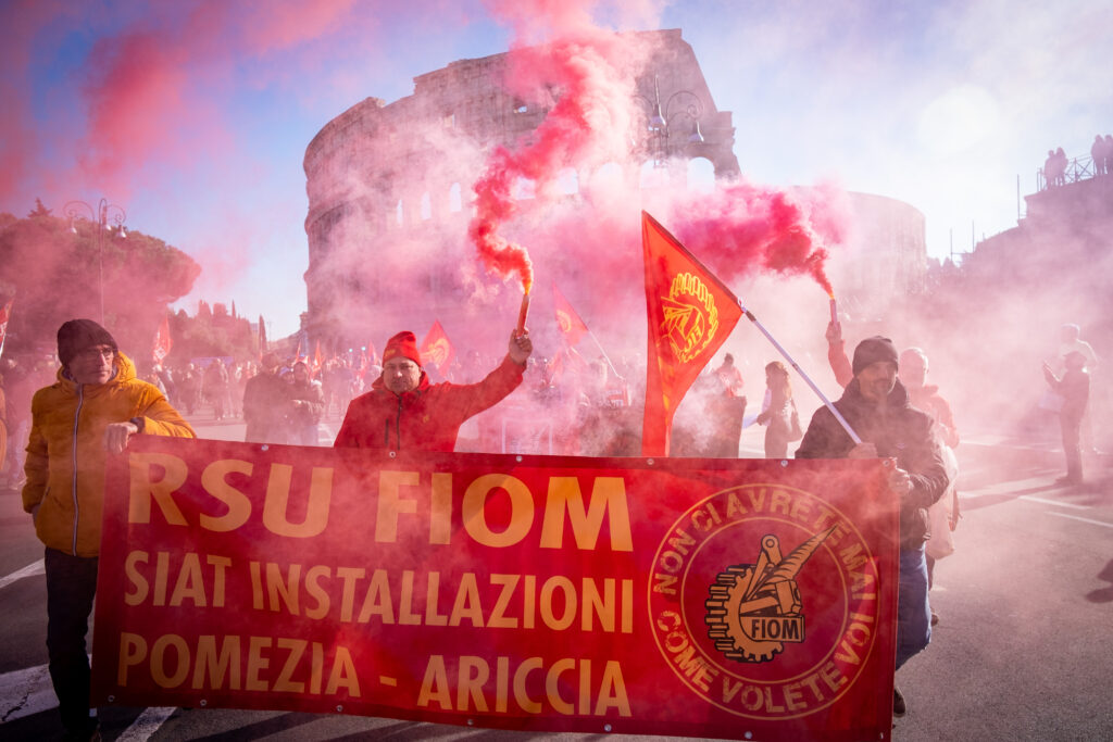 Manifestantes marchan por el centro de la ciudad durante la huelga general nacional convocada por la CGIL contra la ley de presupuesto.