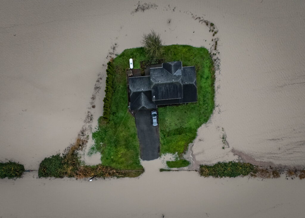 Las aguas de la inundación forman una "isla" y rodean una casa en Abbotsford, Columbia Británica. Se espera que las inundaciones en el valle Fraser de Columbia Británica, causadas por el desbordamiento del río Nooksack en el estado de Washington, alcancen su punto máximo el viernes, mientras las carreteras y algunas escuelas permanecen cerradas y los residentes evalúan los daños.