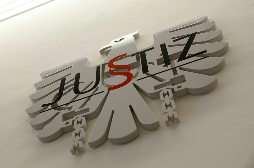 El logo de la justicia en una sala del Tribunal de Distrito Este de Graz. Un tribunal austriaco absolvió el miércoles a dos cirujanos de un hospital universitario de Graz de la acusación de permitir que una niña de 12 años participara en una operación de neurocirugía.