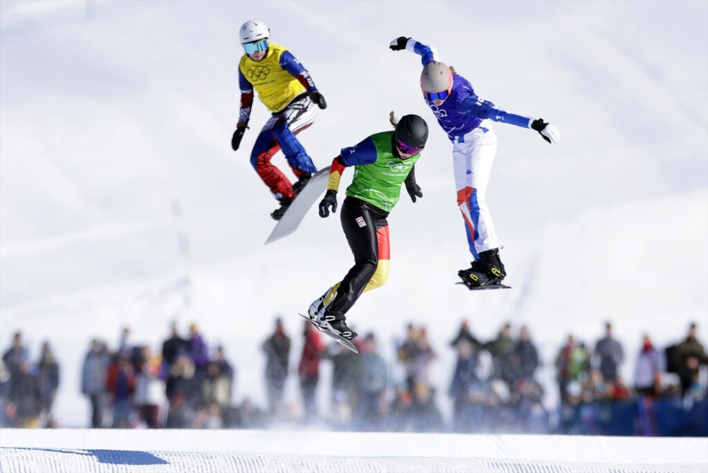Karolina Hrusova del equipo de la Republica Checa, Jana Fischer del equipo Alemán y Chloe Trespeuch del equipo de Francia en los cuartos de final de Snowboard mixto