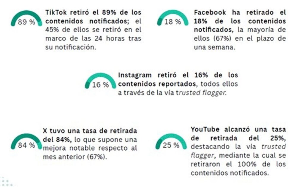 El boletín de Oberaxe refleja que el 89% de contenido racista y xenófobo retirado por TikTok es la tasa más alta de retirada de contenido, frente a Instagram donde solo el 16% de los contenidos acabaron siendo eliminados. Por su parte, Facebook lo hizo con el 18% de los mensajes que le fueron reportados, YouTube con el 25% y X retiró el 84% de los contenidos notificados, frente al 67% en diciembre.